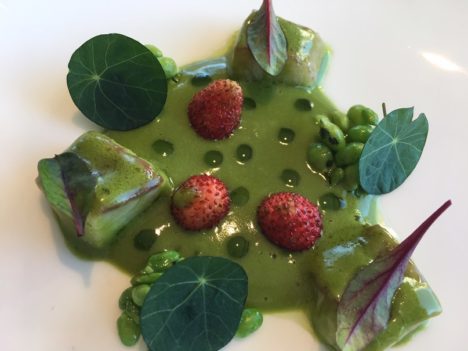 Le gusta a Cerdeño aligerar y refrescar las grasas con toques ácidos, aunque en alguna ocasión la fórmula no funciona bien. Ocurre con un buen plato de anguila con hierbas y guisantes al que le sobran unas fresitas que alteran un poco el resto de sabores. Estupenda la piel de pollo frita con una crema de nata y lima con algo de caviar por encima. Discutimos en la mesa si en esta ocasión está justificado el caviar o responde a la moda en boga. Y al final acordamos que sí tiene sentido su presencia para darle un toque salino que le va bien.
