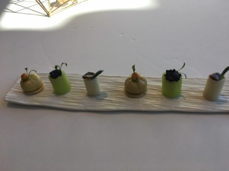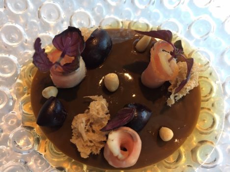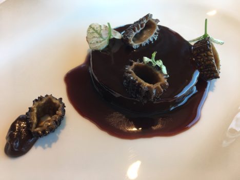 Repite el cocinero la apuesta por el tuétano de corzo que ya probé hace un año. Lo mejora incorporando unas quisquillas en lugar del tartar de cangrejo de la primera versión. Junto al tuétano, en un bocado aparte, un poco de corzo en adobo. También en este bloque, muy interesante el escabeche de perdiz y sardina, escabeche que hace con vino de uva malvar, propia de la zona. Una receta esta de perdiz y sardina que ya se recoge en El Practicón. Y como remate, un sabayón pleno de sabor, acompañado de un hojaldre trufado. Otros dos aciertos.