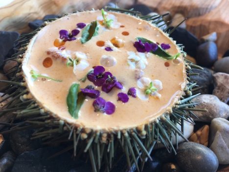 El segundo bloque incluye platos de mar y montaña. Elaboraciones en las que se entrelazan los productos marinos con los de tierra adentro. Hay en esta parte del menú grandes aciertos, como la arriesgada combinación de erizo y morcilla de los Montes de Toledo, que ofrece un resultado sorprendente, perfectamente integrados los sabores. O el plato de espinacas fritas con oreja y espardeñas, refrescado con un toque de limón.