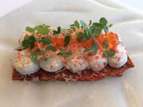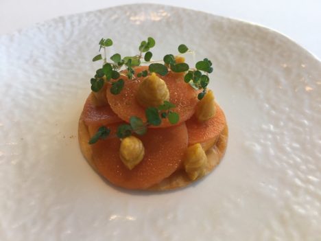 Sigue sin tener carta y sí cuatro menús. Además del largo ya citado, mantiene el de mediodía, de martes a viernes, por 40 euros, y los otros dos que ya tenía, por 60 y 80 euros. La primera parte del menú largo es una sucesión de pequeños entrantes, pensados todos para comer con la mano y casi siempre de un bocado, en los que Cerdeño hace un ejercicio de refinamiento y una decidida apuesta por el sabor, sin renunciar nunca a la estética. Estupendos los tres primeros aperitivos, frescos y ligeros: el pepino encurtido, el nabo con salazones y el garbanzo encominado. Toda una declaración de intenciones porque la apuesta por lo vegetal es muy importante en este comienzo.