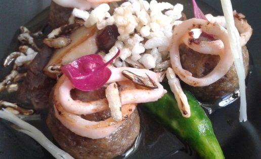 El siguiente plato del menú es un mar y montaña. Un guiso de rabo de toro y chipirones. El rabo, presentado en pequeñas albóndigas, ya lo habíamos probado en Valdemorillo. Pero no en esta combinación con los chipirones. Lleva un potente caldo de ambos ingredientes y se completa con arroz salvaje inflado, okra y setas shitake y enoki. Está rico, pero es el plato que menos llama la atención de todo el menú. Todo lo contrario que la divertida y original “pizztar”, o lo que es lo mismo una pizza de steak tartar. Un juego entre el caliente de la masa y el frío del tartar que funciona muy bien. La carne, que se aliña también con un poco de caviar cítrico, lleva encima una yema de huevo de pollita macerada en kimchi y soja. Al ser un plato para comer con la mano, la yema complica un poco las cosas. Pero aporta sabor.