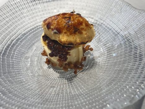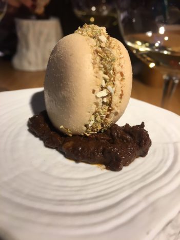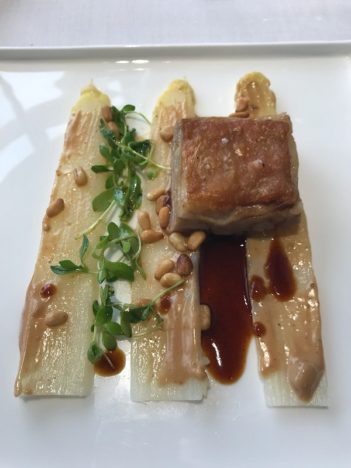 Un bajón importante con el pulpo con papada de cerdo ibérico, yema de huevo frita, ajo negro y jalapeños. Demasiadas cosas y muy poco conjuntadas. No ayudaba tampoco el punto del pulpo. Un plato fallido. Siguió una merluza al vapor con pilpil de perrechicos, en este caso perfecta combinación, aunque alguno de los lomos de merluza que llegaron a nuestra mesa (no todos) estaba algo pasado de cocción. Como remate de la parte salada, buen lechazo asado y deshuesado sobre láminas de espárragos de Tudela con pamplinas y piñones.