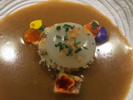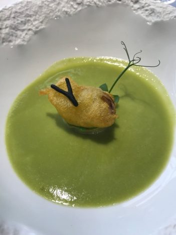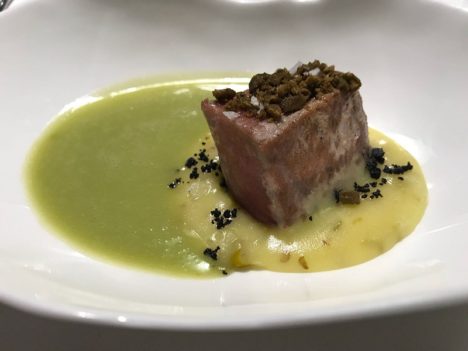 Muy bien los aperitivos, con tres pequeños bocados centrados en la cecina leonesa y un tartar de carne de potro marinada con mostaza y aguacate. Mucho sabor en todos ellos. Daban paso al que para mí, y en general para todos los comensales, fue el mejor plato del menú: una excelente sopa de guisantes con una ostra frita y un flan de alga codium. Suavidad, delicadeza y una perfecta integración de todos los ingredientes. Buenos platos también las alcachofas con mollejas y un toque cítrico, y la versión del vitello tonnato con atún rojo en lugar de ternera.