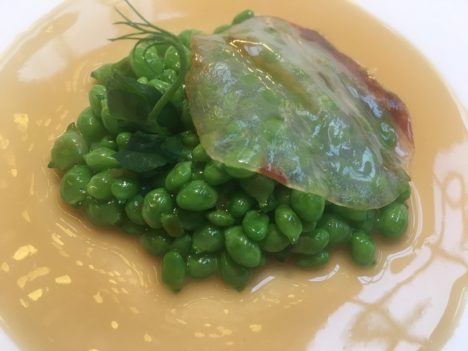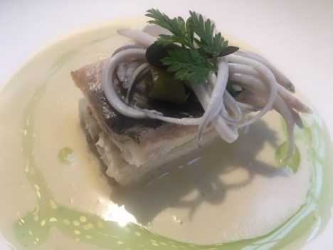 Recuperamos el pulso con los guisantes de Llavaneras, procedentes de la primera floración. Llevan también una crema, en este caso de jamón ibérico, pero todo el protagonismo está en esas delicadas e intensas lágrimas verdes. Unos mejillones de Bouchot con una peculiar versión del gazpachuelo dan paso a otro gran plato, la anguila con angulas y un pilpil de su piel. De nuevo mucha intensidad en la boca, pero también equilibrio.