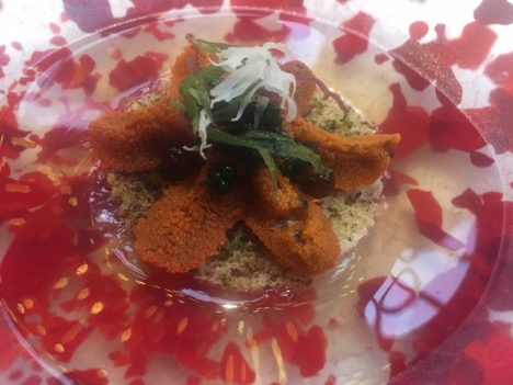 Desde que lograron la segunda estrella en Dos Cielos (estrellas que han trasladado a su nueva casa) se apreciaba un cierto estancamiento en la cocina de los dos hermanos. Sin embargo ahora se les ve con ilusiones renovadas, con muchas ganas de seguir avanzando. Para centrarse más en su trabajo dejan su programa de televisión. Un programa que me parecía más que digno y que les ha dado una gran celebridad. Se lo dejan complicado a su sucesor. Todo eso se traduce en un menú largo (165 euros) de muchos quilates, el mejor de los que me han servido en estos años, con algunos platos verdaderamente sobresalientes y apenas un par de bajones en los dieciocho pasos que lo componen.