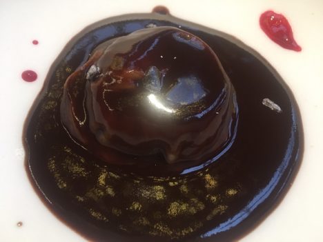 Primer postre una crema de chocolate blanco con trufa negra, mascarpone y migas de centeno. Rica, aunque me quedo con el refrescante juego de vermut blanco y naranjas sanguinas muy cítrico y amargo. Buena tatin de boniato y pepitas de calabaza con helado de yogur, lo mismo que el juego de texturas de chocolate. De todas formas no son los postres lo más destacado de esta casa. Me gusta que el café lo preparen, infusionado, en la mesa. Un buen detalle que agradecemos los cafeteros.