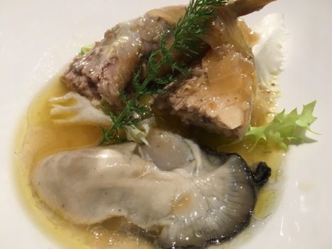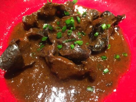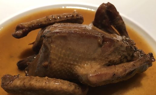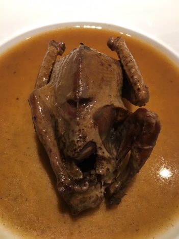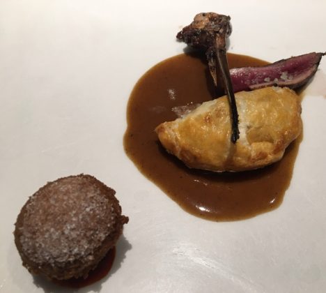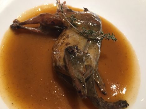 Van apareciendo en la mesa las croquetas de caza menor, muy ricas de sabor aunque se pueden aligerar un poco; el escabeche (una de las banderas de esta casa, que Cecilio aprendió de una señora del pueblo y que han llevado a lo más alto) de perdiz y ostra, mar y montaña perfectamente integrado; y unas sorprendentes cachuelas (mollejas) de pichón guisadas en lo que todos en la mesa pensamos que es un curry y no es más que un fondo al que se le ha añadido pimentón y comino. Magníficas estas mollejas en las que ya encontramos otra línea básica de esta cocina, las salsas y los fondos, bien ligados y plenos de sabor.