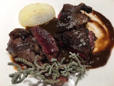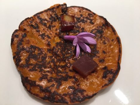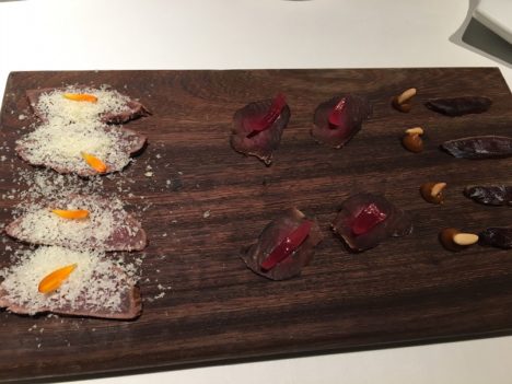 Ramón nos ofrece un champán de pequeño productor, Val Frison blanc de noirs, para acompañar los aperitivos. El primero, una torta tostada de sopas de ajo, adornada con una flor de ajo. Luis Alberto quiere recuperar las tradicionales sopas de su tierra, que se tostaban por encima. El segundo ya nos introduce directamente en lo que va a ser el único hilo argumental de toda la cena, la caza. Con unos pequeños cortes de paloma y de ciervo en salazón, muy logrados, y un rosbif de jabalí, entramos de lleno en los sabores del invierno en Tierra de Campos. Caza, caza y caza.
