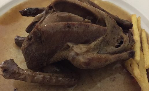 Empezamos la noche con unas anchoas para acompañar el vermut del aperitivo. Y seguimos abriendo boca con una agradable ensalada de pamplinas (que en aquella zona conocen como marujas) con virutas de foie gras. A partir de ahí ya entramos en materia. Un rosbif de jabalí ahumado, muy sutil, con bearnesa como acompañamiento, y unas pechugas de paloma en blanqueta con trufa negra y colmenillas. Las últimas trufas y las primeras colmenillas de la temporada conviviendo en el plato y complementando perfectamente la intensidad de las pechugas en su punto de sangre.