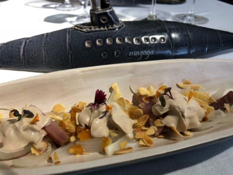 Un punto fuerte de Magoga son los quesos. Asesorado por Abel Valverde, Adrián de Marcos, que dirige la sala y la bodega, maneja medio centenar de piezas de orígenes muy variados. Tentadora oferta que, con acierto, se incluye en el precio del menú. Para terminar, dos postres. Piña en texturas a la que se añade una pequeña cantidad de un excelente vinagre de Monastrell con treinta años, y chocolate con helado de algarroba. Correctos ambos, aunque por debajo de los platos salados. Buena selección de vinos la que nos hizo Adrián, desde generosos como el fino La Barajuela 2013 o el palo cortado Marqués de Rodil de Hidalgo, hasta dulces como un Marsala de Marco de Bartoli, un Carcavelos Villa de Oeiras o un monastrell dulce 2013 de Olivares, pasando por un Casa Castillo de Jumilla, algún riesling y el peculiar rioja alavés Phinca Hapa.