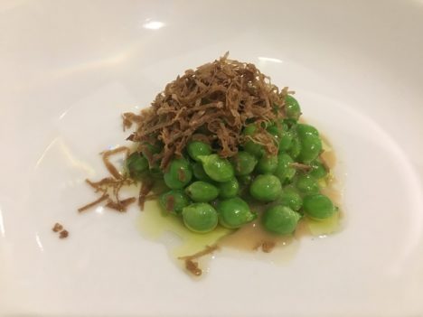 Del capítulo de entradas, excelentes dos platos de verduras en los que emplea algunas cultivadas en navazo en Sanlúcar, un proyecto muy prometedor que ya está dando estupendos resultados. Ahí están para demostrarlo el plato de verduras que prepara con emulsión de yema de huevo y un escabeche de pollo. Y también unos guisantes tiernos que elabora con una meuniere de mantequilla tostada y amontillado y sobre los que ralla trufa blanca. Mucho nivel también en la codorniz de Las Landas con níscalos y un jugo de setas, un plato en el que Ramos exhibe su técnica, lo mismo que en un carabinero con daditos de tuétano y crema de calabaza que es una de las pocas elaboraciones en las que muestra verdadero atrevimiento.