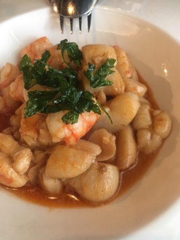 También hay una parte menos positiva. En la gamba marinada con un sorbete de cítricos y gazpacho de su coral nos anuncian que uno de los ingredientes es sichimi togarashi, esa mezcla japonesa de especias. Pero apenas aparece en un plato en el que además sobra el sorbete, que casi nada aporta al conjunto. Tampoco nos convence el guiso de tendones de ternera con un jugo de berberechos anisado y carpaccio de galeras. El jugo, que probablemente lleva placton, desequilibra por completo el plato.