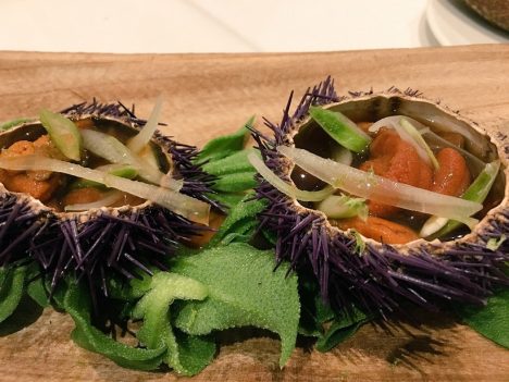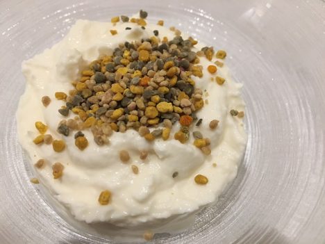 Divertido el coulant de cocido de garbanzos y muy refrescante la sopa de manzana y sidra con requesón y rúcula, convertida ya en un clásico de Naguar. En plena temporada no pueden faltar los oricios, estupendos. Pedro nos saca también una molleja de ternera asturiana rustida con hierbas. Deja ver aquí su excelente técnica, perfecta de punto la molleja. Y terminamos con un postre tradicional asturiano, la barreña, que se hace a partir de queso fresco de vaca, leche y azúcar, una especie de requesón. Martino le añade un toque muy especial, polen fresco que consigue en la zona de Muniellos que aporta un sabor y una textura bien peculiares.