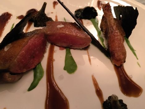 Otro ejemplo de la buena técnica del cocinero llega con el pichón de Araiz. Impecable la pechuga, jugosa, con su punto de sangre. Al lado, los muslitos fritos. Como guarnición, en una línea muy clásica, jugo de ciruela y unas lascas de chocolate. Lleva también un sutil toque de mostaza.