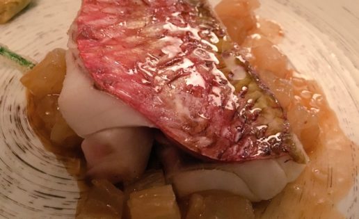 Loya siempre ha trabajado muy bien los pescados. De casta le viene al galgo. Al fin y al cabo la escuela del Real Balneario de Salinas, la casa familiar, el mejor restaurante de producto de Asturias, le ha marcado mucho. Estupendo el lomo de salmonete (foto que encabeza el post), que por sí solo ya merece la pena. Sin distorsionarlo, lleva debajo un guiso que en la carta se anuncia “de sus callos” y que en realidad es de tendones. Equilibrado juego de mar y montaña que se completa con unas cebollitas con limón. Al lado, como guarnición, unas coles de Bruselas en tempura.