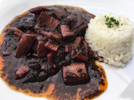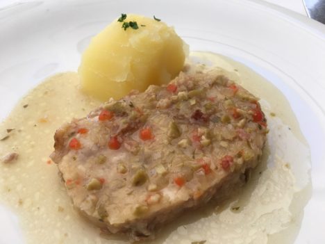 En verano hay dos platos imprescindibles en Nito. Dos guisos que en esta casa alcanzan niveles de excelencia. Uno son los calamares en su tinta. El otro el rollo de bonito, que como saben los habituales del blog es uno de mis platos favoritos. El de esta casa está a la altura de los mejores que se pueden comer en Asturias (entre ellos los de Casa Consuelo, Casa Tataguyo, Casa Nuevo o Casa Belarmino). Los dos, calamares y rollo, cayeron en nuestra comida. Los primeros, cortados en trozos, muy tiernos, con una salsa perfectamente ligada a base de cebolla en la que mojar mucho pan. Como guarnición, un buen arroz blanco, que es la mejor compañía para este guiso. El rollo de bonito al nivel de siempre. Un jugoso pastel con el bonito picado con jamón, huevo cocido y aceitunas y una salsa de verduras. Como único acompañamiento una patata cocida.