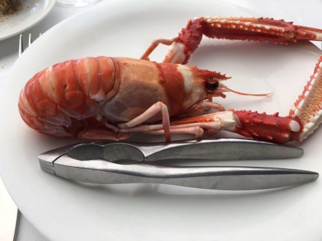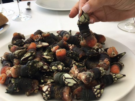 Antes de los dos guisos, algo de marisco. En concreto, percebes y cigalas. En la puerta del restaurante habíamos visto al percebeiro con una caja con percebes de espléndido aspecto. Nos dijo que faltaban los mejores, los que acababan de seleccionar en el restaurante, pues ellos son los primeros que eligen. Así que a la vista de lo visto no tuvimos más remedio que pedir una ración. Magníficas piezas, gruesas y bien llenas. En cuanto a las cigalas, bichos de unos 300 gramos, espectaculares. Cuando son de este tamaño yo las prefiero cocidas, como las tomamos, mejor que a la plancha, más adecuada para las pequeñas.