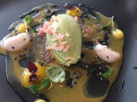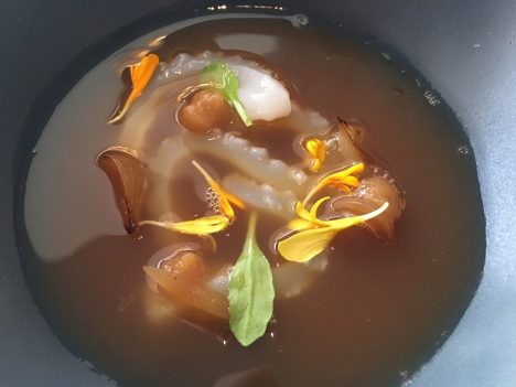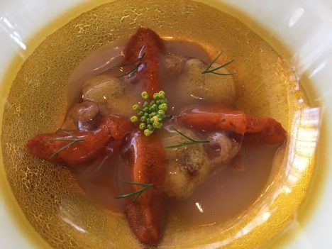 Por fin subimos al comedor, con la sensación de que nos podíamos haber evitado el recorrido previo. Y allí, sentados con comodidad y bien atendidos (me gusta el trabajo que está haciendo Alejandro Rodríguez al frente de la sala) empiezan a llegar una serie de pequeños y agradables bocados que de nuevo pretenden dar la vuelta al mundo: pato laqueado, cochinita pibil… De esta serie me quedo con los guiños a la caza, tanto la avellana con parfait como la morcilla de zorzal. De nuevo me sobra una cosa: el consomé de caza con armagnac. Un recurso demasiado visto y que ya aporta muy poco en un menú. Desde el que comenzara a ofrecer Ferrán Adriá en las últimas temporadas de El Bulli hemos tomado ya demasiados.