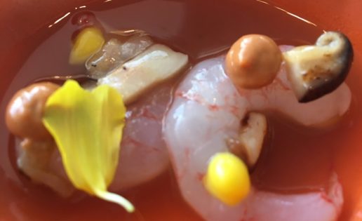 A partir de ahí viene el bloque principal, en el que el producto brilla con fuerza. Probablemente nunca ha trabajado (y respetado) tanto la materia prima Paco Roncero como en este menú. Es la parte más brillante, la que sí nos recuerda que estamos en un dos estrellas. Las quisquillas con mango y panceta ibérica (foto que encabeza el post) son un bocado excelente, como lo es el calamar encebollado, pasado mínimamente por el fuego y con un intenso y limpio caldo de cebolla muy notable. En esa línea me gusta mucho también el erizo con tendón e hinojo. Producto de calidad, bien tratado y sin artificios innecesarios. No puedo decir lo mismo de una cococha de merluza (¿por qué los restaurantes de Madrid ser empeñan en escribir “kokotxa”?) con un pilpil de curry demasiado plano de sabor que en este caso sí distorsiona a la verdadera protagonista. Por contra me gusta mucho un canapé de setas y zorzal con su piel y salmís.