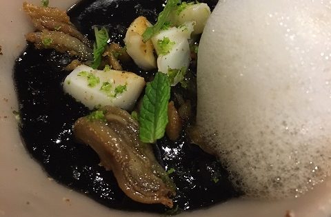 Como aperitivo, las croquetas. Imprescindibles. No creo que sean “las mejores del mundo” como se afirma en ese concurso croquetero de nombre rimbombante (y poco cierto) que se celebra cada año en Madrid Fusión, pero están muy buenas. En la línea de las que borda Nacho Manzano, su maestro en esas y en otras tantas cosas. Seguimos con un excelente guiso de calamar y chile chipotle con pasta, un pilpil de ajo negro y trufa. Probablemente el mejor plato del menú.