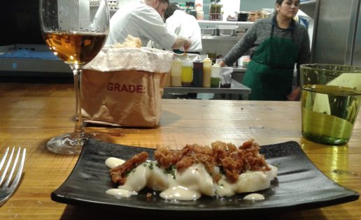 En apenas tres semanas ya registran llenos diarios, incluso doblando mesas. No me extraña porque en una primera aproximación me ha gustado mucho. Por cómo está montado, por la amabilidad que despliegan en la sala Erika e Ignacio, y por la comida. Todos los platos llevan algo relacionado con ellas: foie con manzana, ensalada de perdiz en escabeche, croquetas de ave (buenísimas, por cierto), alitas de pollo, codorniz en tempura (lo más flojo, mejorable el rebozado), arroz meloso con pato, consomé de ave, garbanzos con oca guisada (gran guiso, disculpen la foto que no le hace en absoluto justicia pero la iluminación del comedor es mínima), pochas con pichón, lentejas con perdiz… Y luego, como platos fuertes, pajaritos asados en brasas de encina natural y sarmientos pichón, codorniz, contramuslo de gallo, pollito coquelet (excelente, pollos que llegan de Francia, con mucho sabor y llegan a la mesa muy jugosos). Se completan con salsas y guarniciones a elegir, que se sirven aparte, a la francesa. De las primeras, en las que frente al clasicismo de los platos hay muchos guiños asiáticos, encontramos desde una thai (poco) picante hasta una barbacoa coreana o una provenzal. Más clásicas las guarniciones: patatas fritas, ensalada verde, escalibada…