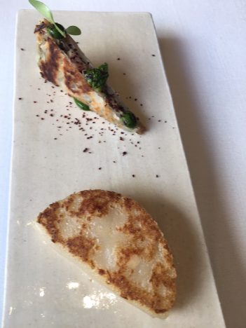 La berenjena asada es el hilo conductor (como el arroz, me dice Ricard) de un plato que reúne ventresca de atún rojo y una emulsión de hierbas de costa con un punto picante. Y volvemos a las salsas, probablemente la mejor del menú. Se trata de unas cocochas con holandesa de la propia merluza. Espectacular. Junto a ellas, espárragos de conserva propia, estragón y unos toques de levadura que aportan enorme potencia.