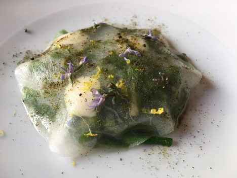 El siguiente paso, ya asentados en la mesa del comedor, incluye bocados de cebolla rellena de mantequilla de anchoas y ajo negro; patata nueva con all i pebre y almendra (lo más flojo de esta serie de aperitivos), y un higo que sirve de soporte a carne de pato. Un tercer bloque nos trae apio a la brasa relleno de pollo y mostaza, y un mini sándwich de cabrito con puerro y menta. Una sucesión de bocados ligeros y sabrosos que marca la tendencia de lo que será un excelente menú.