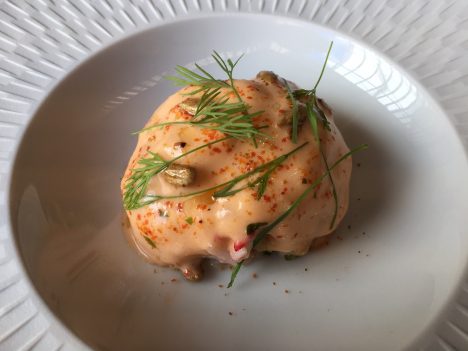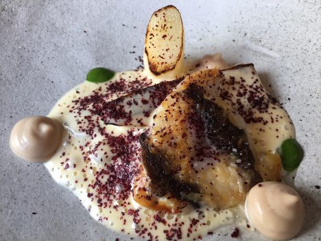Vuelta a la mesa, donde comienza el menú propiamente dicho. Y lo hace con un capuchino. Elaboración que a Ricard gusta mucho y que está siempre en sus menús. Pero en este caso ese capuchino frÃo es de una meuniere de bogavante. Encontramos aquà el primer ejemplo del trabajo que el cocinero está haciendo con las salsas a partir del propio producto. Reforzado el sabor con alcaparras y pipas, y con la textura de unos costrones de pan. Excelente plato.