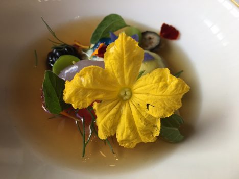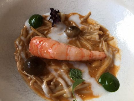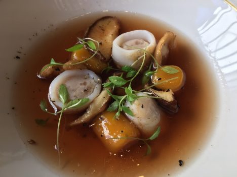 Tanta potencia perjudica al siguiente plato, en el que una delicada gamba roja de Denia se pierde entre el sabor del plato anterior y el del curry rojo que la acompaña. Debajo hay setas enoki presentadas como si fueran pasta. A continuación un caldo, primero (salvando la infusión de tomate ahumado de la manestra) y único del menú. Un consomé de calamar y manzanilla, estupendo. Flotando, trozos de calamar, ñoquis de calabaza y setas. Reencuentro con la mejor escuela de Camarena.