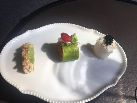 El juego con verduras y hortalizas es evidente desde el primer momento, con una serie de aperitivos que las tienen como protagonistas. Empezando por la agradable infusión frÃa de verduras asadas, hierbabuena y amontillado que abre el menú, todavÃa en el bar de acogida. Le siguen tres bocados intensos: lechuga que envuelve una ensaladilla rusa de corvina, piel de calabacÃn como soporte de un steak tartar con requesón, y nabo con rábano y huevas de arenque.