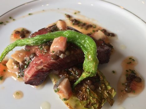 La única carne es un roast beef de solomillo de vaca ahumado con vinagreta de lentejas. Además, anguila ahumada y (que no falte la verdura) un cogollo a la brasa. Demasiado humo, que acaba saturando el paladar. Y encima teniendo en cuenta que es el último plato fuerte del menú.