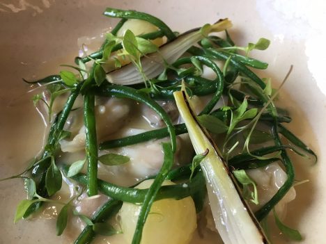 Y volvemos a las salsas. Como en los casos anteriores (meunier, holandesa), una bien clásica, la velouté. Hecha con el colágeno de la cabeza del rodaballo que, troceado, aparece en el plato. Se logra asà texturizar la salsa. Patata, judÃas Bobby y cebolleta completan un gran plato.