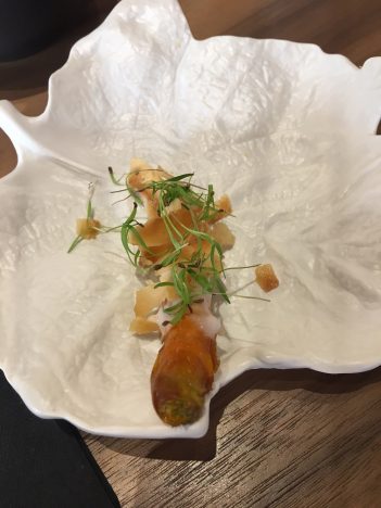 En ese momento, el comensal es invitado a acercarse a una mesa alta junto a la cocina. Allà el propio Camarena explica su lÃnea de trabajo de una forma práctica. Una zanahoria pequeña (no baby) de cultivo local sirve como ejemplo. Está marinada en jugo de anchoa (ese Letern, umami de mar, que ahora comercializa) y luego asada. La envuelve en crema de coco y le añade lascas de coco tostado y brotes de zanahoria. Un sabor diferente a partir de un producto perfectamente identificable.