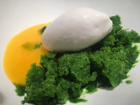 Para refrescar la boca tras los quesos, el puré de mango, granizado de albahaca, coco y rábano raifort es un primer postre muy adecuado. La repostería a cargo de Montse Abella ha alcanzado también en estos años niveles sobresalientes en Santceloni. El borracho de calvados con nueces y trufa negra, la crema de café con mousse de chocolate cocida, o la crema de queso ahumado con granizado de ruibarbo y chicharrones caramelizados son buena muestra del excelente trabajo de Montse.