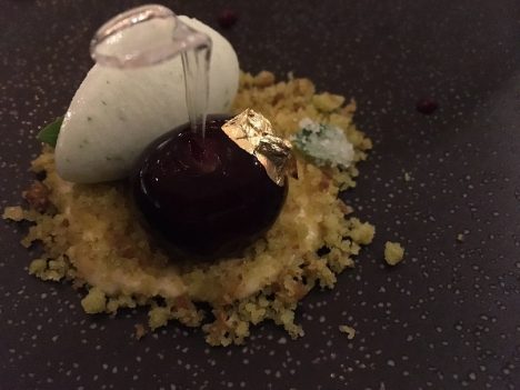 Dos postres con nivel. Primero la cereza con albahaca y almendra tierna. Después una combinación de cúrcuma, maracuyá y coco, fresca y agradable. Para beber, una copa de champán con las entradas; albariño Pazo Piñero 2011; y ese excepcional rioja que es el Artadi Viñas Viejas 2005. Por medio, Marcos Granda nos invitó a una copa de ese Mersault Clos de la Barre 2005 uno de los vinos del menú Grand Cru.