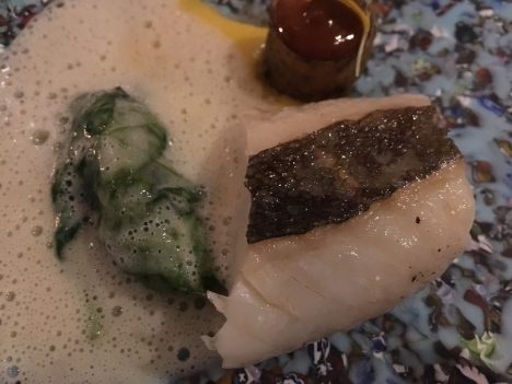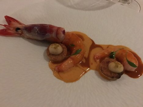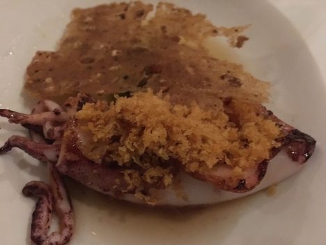 La gamba roja con curry es también estupenda. La cabeza aparte para chupar, y el cuerpo arropado por un curry suave y, de nuevo, elegante. Me sobran por completo unos blinis de coco que distraen un tanto de lo principal del plato. Tras la gamba, un chipirón pequeño que llega de Galicia, apurando la breve temporada de un producto tan delicado. Va con setas, caldo de ibéricos y un crujiente de butifarra. Demasiadas cosas. Un chipirón de esa calidad merece mayor protagonismo.