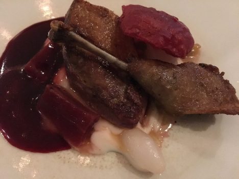 Por el contrario, sí le van muy bien los acompañamientos a un pez san pedro que también ha llegado de Galicia. Desangrado previamente para darle una textura más tersa. Va con pimiento dulce y una crema de moluscos que lo potencian. Como pega, el punto, ligeramente pasado. Para rematar la parte salada un pichón asado. Aquí el punto es perfecto. Sale a relucir la buena técnica del cocinero, que arriesga presentándolo con una salsa suave de remolacha. Y un trozo del mismo tubérculo frito, a modo de patata suflé. Muy bueno.