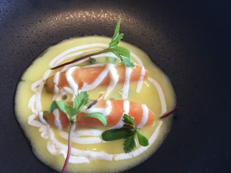 Espléndidos los camarones con algas y oreja de cerdo. Las cabezas de los camarones aparecen fritas al lado. Un grandísimo plato que abre un trío en el que se concentra lo mejor del menú. La segunda baza son unos guisantes con tuétano, plato con una intensidad clorofílica magnífica. Y la tercera unas sencillas zanahorias ecológicas blanqueadas sobre un escabeche cremoso y espinacas. No se puede sacar más partido de un plato vegetal. Se sirve con un zumo de zanahoria, pepino, jengibre y lima que está bueno, pero no aporta nada al conjunto.