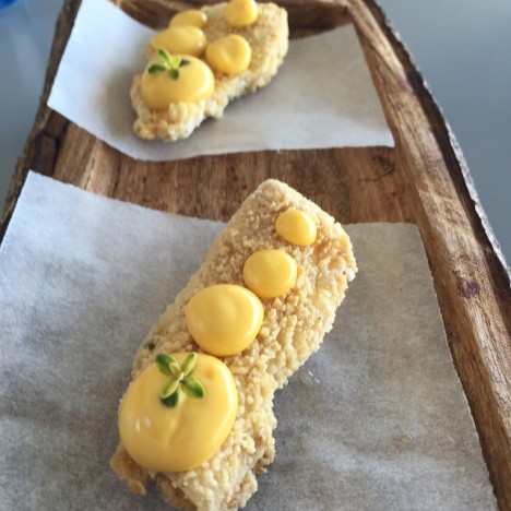 Gallegos emplea alevines de trucha para simular anchoas. Un juego interesante que ya habíamos visto practicar a Enrique Pérez en El Doncel de Sigüenza, en aquel caso haciéndolos en vinagre como si fueran boquerones. Un tanto subidos de sal estos de Sollo, pero suavizados con puré de mango. Al lado, la raspa frita con un puré también de mango. Vuelve el alevín de trucha, en esta ocasión entero, hecho a la parrilla japonesa. Mejor esta segunda versión, aunque menos original.