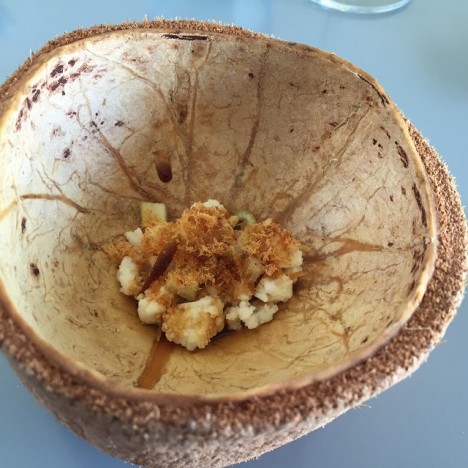 Gran plato el requesón de coco y katsuobushi de tilapia. El coco, con su grasa, se cuaja y se sirve en propia cáscara. Se complementa muy bien con las escamas secas del pescado, un poco de apio y salsa ponzu. Y estupenda también la anguila con papas aliñás y salsa kabayaki, que como saben es la que suelen emplear los japones para este pescado a base de soja, mirin, azúcar y los descartes de la anguila.