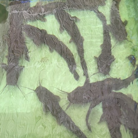 Antes de pasar al comedor, Diego me lleva a dos espacios de los que se siente especialmente orgulloso. Uno está al fondo de las piscinas del hotel. Un pequeño rincón donde ya el año pasado tenía una pequeña huerta para abastecerse de algunas hierbas y verduras. Allí ha instalado dos grandes tanques de agua, con un complejo sistema de purificación, en los que mantiene vivos diferentes pescados de los que utiliza en su cocina. En uno, tilapias. En otro bagres, también conocidos como peces gato, y anguilas (en la imagen que encabeza esta entrada pueden ver al cocinero con un bagre vivo). En breve habrá un tercero para las pirañas, con las que abrirá una nueva línea de trabajo. Dice que están muy buenas. Las probaremos. El segundo espacio está en los sótanos del hotel. Allí ha montado un pequeño recinto de I+D para trabajar con su equipo y seguir explorando las posibilidades de esos pescados de río.