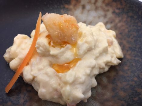 Por medio le hemos pedido a Calleja que nos ponga unas tortillitas de camarones. Como les decía al principio, son imprescindibles. Nos las presenta junto a unos boquerones impecablemente fritos. Y le hemos pedido también una muestra de la ensaladilla de langostinos con mayonesa de su escabeche. Magnífica también. De lo poco que conserva de la primera etapa de Surtopía.