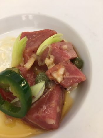 Estos días apura los últimos atunes de almadraba, que recibe directamente de su proveedor de pescado en Sanlúcar. Ha hecho con ellos platos muy interesantes incorporados a la carta o reunidos en un menú degustación especial por 65 euros. Hace unos días pude probar varios de ellos, con un nivel más que notable.