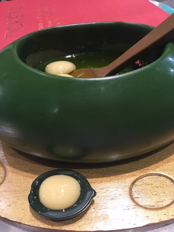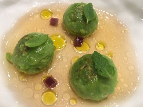 Hay más cosas para comer con cuchara. Por ejemplo el potente suquet de salmonete con alcachofa (confitada una, frita otra) y unas bolitas de tapioca. Notable, pero por debajo de una de las tapas que más me gustó. Una reinterpretación de las habas a la catalana a partir de unas albóndigas de butifarra blanca y habas frescas en un consomé de jamón ibérico con menta. Enorme plato (o mejor dicho, tapa).