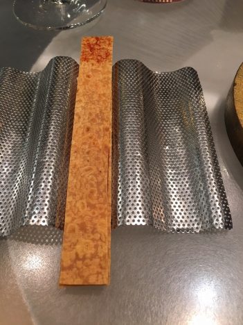 A Albert Adriá le gusta recuperar algún clásico de la cocina. Estos días tiene un foie gras que elaboran en Tickets a partir de hígados de oca de Mitteault, uno de los mejores proveedores de este producto en Francia. Lo hacen al carbón, relleno de anguila ahumada. Y está muy bueno. Tras él, una ingeniosa conversión de una sopa en tapa. Una miga de brioche con azafrán en el plato sobre la que se vierte el caldo. Y ya tenemos una sopa de pan a tamaño reducido. Buenísima, por cierto.