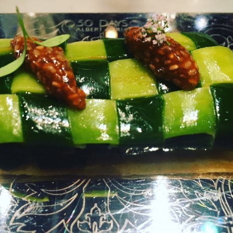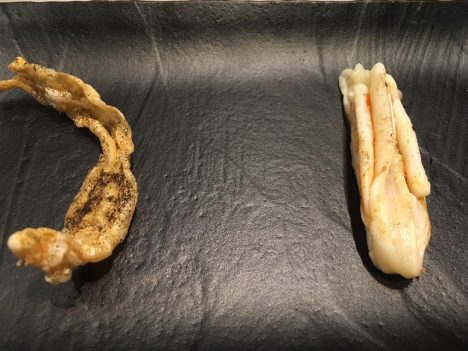 Y sigue el festival. Con el “paisaje nórdico”, una fina tostada con una lámina de solomillo de vaca marinado, crema de queso ahumado, cebolla encurtida y polvo de vinagre. Mención especial para la atrevida espardeña rellena de sobrasada. Funciona muy bien. Al lado, su piel frita con té negro y limón marroquí, contraste de texturas. Y una tapa de pulpo, marinado, con mayonesa de kimchi y rebozado en panko para darle un punto crujiente. Un trozo de pepino encurtido lo refresca. Me cuenta el camarero que es uno de los favoritos de la clientela. La verdad es que está rico y es original, pero me quedo antes con muchas otras tapas.
