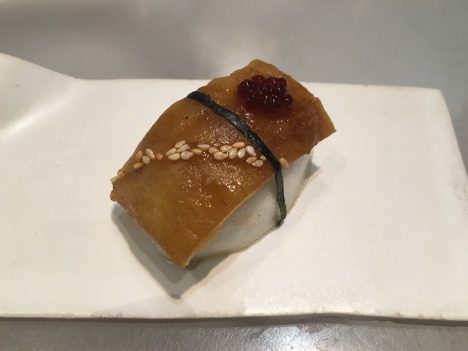 Me gusta especialmente el milhojas de alga codium, erizo y rábano picante, un bocado de intenso sabor, con los ingredientes muy equilibrados. Casi siempre se cuida mucho la estética. Donde más, en el atadito de aguacate, un vistoso damasco de aguacate y cilantro que envuelve carne de buey de mar con mayonesa de chipotle y semillas de chía. Curiosamente, pese al chipotle, le falta la intensidad de otras tapas. La que tiene, por ejemplo, el canapé de anguila al carbón con yuzu, sobre una lámina fina y crujiente de pan (foto que encabeza el post).