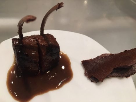 Antes de pasar a los postres, Albert me presenta una elaboración todavía en pruebas. Dos pequeñas chuletas del costillar de una liebre guisadas en una salsa muy reducida. Y un pequeño bocadillo de láminas de cacao que contiene su hígado. Impecable cocina de caza. En una de las costillas aparece un perdigón. Me cuenta Adriá que las liebres proceden de Francia. Y por lo visto son de tiro. Añade a este plato un “efecto especial”. Un cocinero deja una jarra con lo que asegura que es la sangre del bicho. Cuando retiran el plato, llega otro con una nieve de manzana, muy blanca. Y sobre ella vierten un poco de la sangre (que lógicamente es jugo de remolacha). Pero el efecto de sangre sobre la nieve es muy divertido. Y además, está buena.
