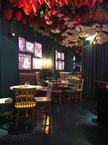 Acabada la parte salada me invitan a pasar a la otra zona, oculta tras un pasillo con grandes cortinas. Es el comedor de los postres, decorado al efecto. Allí ejercen los pasteleros y un buen barman, Borja Lucini. Es el remate perfecto. Al entrar, entregan una rosa natural que lleva en el centro una esfera de lichi y frambuesa con agua de rosas. Y ya sentados, los clientes eligen las tapas dulces.
