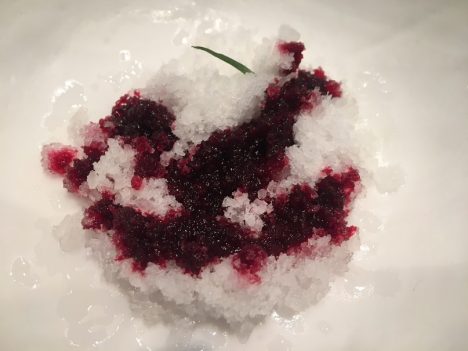 Y siempre detalles y guiños divertidos basados en el dominio de las técnicas. La excelente gamba roja marinada se sirve sobre una base de sal helada (me gusta el comentario del camarero: la cabeza es la salsa de la gamba). O la ventresca de atún que se confita en grasa de jamón ibérico. O el niguiri vegetal, en el que el arroz se reemplaza por un merengue de lima y el pescado por berenjena a la llama, con unas perlas de soja encima.Juegos de cocina que aparecen de nuevo en el “porex de Kalix”, en el que la base, que imita a una caja de porexpan, es una nube de crema ahumada y rábano picante que contiene caviar de Kalix. Muy interesante la navaja que se sirve cruda (previamente limpiada) con una salsa de aceite y ají amarillo donde se deja reposar para que se marine. La navaja es excelente y la textura que se logra, lo mismo.